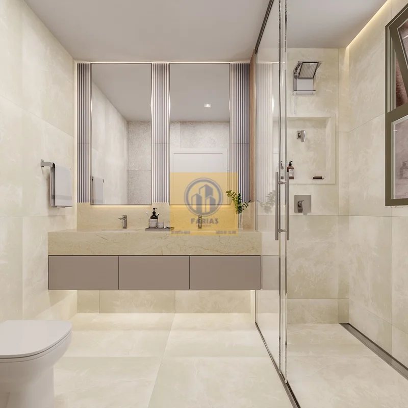 Piso e paredes do banheiro master em porcelanato 80×80 cm